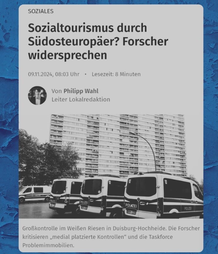 Die WAZ hat über die Forschungsergebnisse des Projektes „Diskriminierung jenseits der Kategorien“ berichtet: „Das bittere Fazit der Studie: Die Diskriminierung in der Arbeitswelt, auf dem Wohnungsmarkt und beim Zugang zu sozialen Rechten verschärft die prekäre Lage südosteuropäischer Migranten in Duisburg. Die abwehrende Ausrichtung der Stadtverwaltung und bürokratische Hürden verschlimmerten und verstetigten die prekäre Lage der Zugewanderten, anstatt sie als EU-Bürger und wichtige Arbeitskräfte zu unterstützen. Besserung sei nicht in Sicht.“